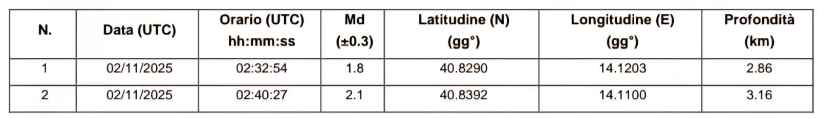 Nuove scosse di terremoto avvertite a Pozzuoli. L’Osservatorio Vesuviano ha comunicato all’Amministrazione Comunale di Pozzuoli “che a partire dalle ore locali 03:20 (UTC 02:20) del 02/11/2025 è in corso uno sciame sismico nell’area dei Campi Flegrei. All’orario di emissione del presente comunicato sono stati rilevati in via preliminare 5 terremoti con magnitudo Md ≥ 0.0 (4 localizzati) e una magnitudo massima Md = 2.1± 0.3“, viene spiegato in una nota. In considerazione di quanto sopra esposto “l’Amministrazione Comunale insieme alla Protezione Civile del Comune di Pozzuoli segue da vicino l’evolversi dello sciame sismico in atto e fornirà successivi aggiornamenti fino a conclusione del fenomeno“.