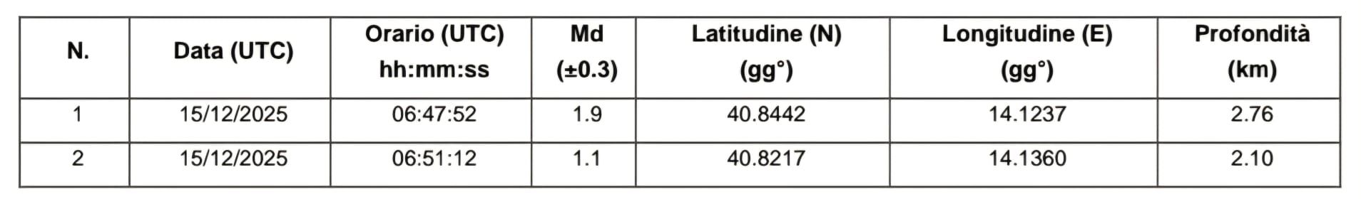 L’Osservatorio Vesuviano ha comunicato all’Amministrazione Comunale di Pozzuoli “la conclusione dello sciame sismico iniziato alle ore locali 07:47 del 15/12/2025 (UTC 06:47) e costituito in via preliminare da 6 terremoti con magnitudo Md ≥ 0.0 (5 localizzati) e magnitudo massima Md = 1.9 ± 0.3 localizzati nell’area dei Campi Flegrei“, viene spiegato in una nota. Si ricordi che la definizione di inizio e fine di uno sciame sismico nei Campi Flegrei segue dei criteri precisi. Di seguito l’elenco complessivo degli eventi localizzati con magnitudo Md ≥ 1.0.