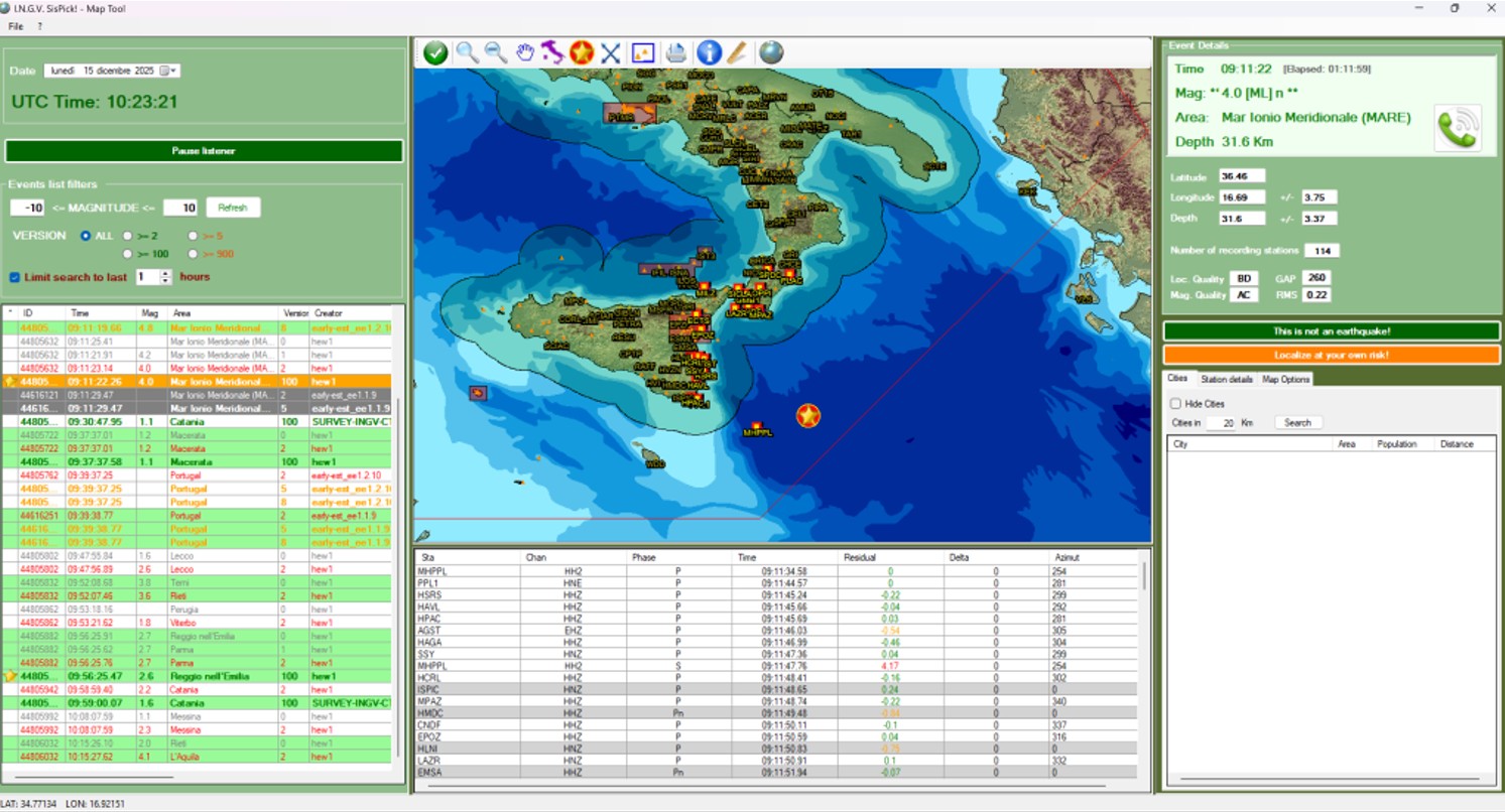 Stamattina, alle ore 10:11 italiane del 15 dicembre 2025, la Sala di Sorveglianza Sismica dell’INGV-Roma ha localizzato un terremoto di magnitudo Richter ML 4.0 nel Mar Ionio meridionale, ad una profondità di circa 32 km. “Normale routine, se non fosse che alla sua localizzazione ha contributo la stazione sismica MHPPL (Marine Hazard Portopalo), il sismometro più profondo del Mar Mediterraneo, installato a circa 3500 metri di profondità, a circa 80 km a sud-est di Portopalo di Capo Passero. La stazione sismo-acustica ad alta sensibilità denominata SEASMO è integrata nel sistema di localizzazione della Sala di Sorveglianza Sismica dell’INGV e rappresenta un prolungamento a mare della Rete Sismica Nazionale. Grazie alla sua posizione strategica, fornisce dati cruciali per una determinazione più precisa dei parametri dei terremoti che si originano nel cuore del Mediterraneo, anche grazie al fatto che è collegata a terra via cavo elettro-ottico, consentendo così di usare i dati ad elevato campionamento e in tempo reale.