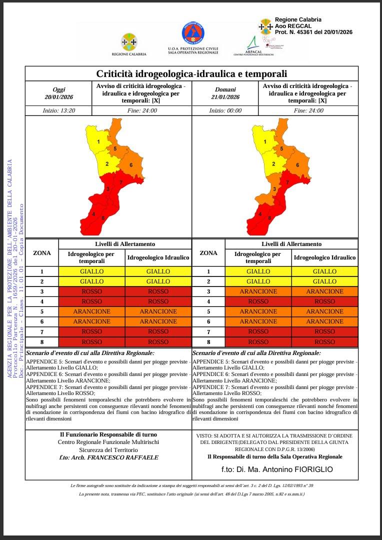 La Protezione Civile della Calabria ha esteso l’allerta rossa anche alla giornata di domani, mercoledì 21 gennaio, alla luce del persistere delle condizioni di maltempo estremo. Proprio nelle prossime ore, tra stasera e domani, la Calabria vivrà infatti la fase clou del peggioramento provocato dal Mega-Ciclone Harry. L’allerta domani sarà rossa in tutto il territorio delle province di Reggio Calabria, Vibo Valentia e Catanzaro, ma anche in alcune porzioni (le più meridionali) delle province di Crotone e Cosenza.