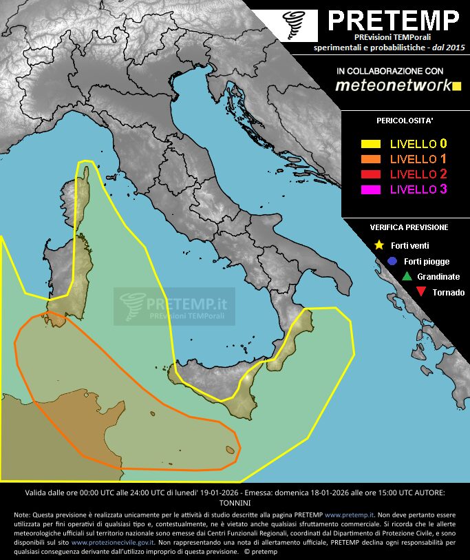 Nella giornata di oggi lunedì 19 gennaio 2026, “la risalita di un vortice dal Nord Africa ed in lento spostamento verso il Mediterraneo occidentale darà luogo ad una fase di intenso maltempo su parte del dominio meridionale, in particolare lungo il versante ionico di Calabria e Sicilia, nonché lungo i canali di Sicilia e Sardegna e sui rilievi dell’Isola sarda e della Corsica, con precipitazioni persistenti di moderata o forte intensità“, si legge nel bollettino PRETEMP.