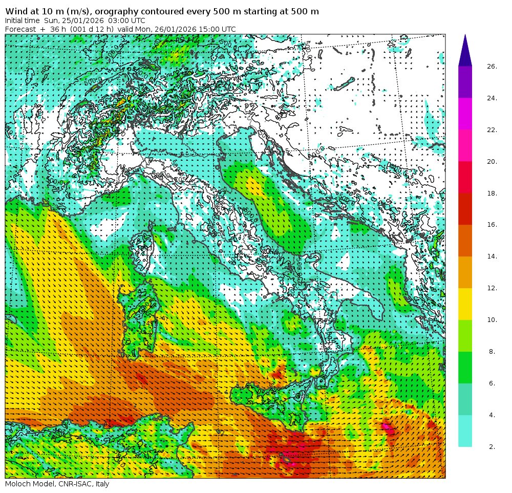Domani, lunedì 26 gennaio, il maltempo si concentrerà proprio al Centro/Sud, anche se al mattino persisteranno ancora piogge sparse e temporali in Toscana e all’estremo Nord/Est, su Trieste. Già dalla mattinata, però, il fronte freddo si posizionerà nel basso Tirreno portando piogge e temporali tra Sardegna, Campania, Basilicata, Calabria e Sicilia. Le piogge saranno intense, con nevicate sui rilievi oltre i 1.200 metri in Sardegna e oltre i 1.300 metri nel resto del Sud. Ampie schiarite, invece, sulle Regioni Adriatiche e al Nord/Ovest, in Piemonte e Lombardia (attenzione alle minime molto basse per inversione termica da cielo sereno ed effetto albedo dove ha nevicato nelle scorse ore. Possibili valori fino a -10°C in pianura e nei fondovalle).