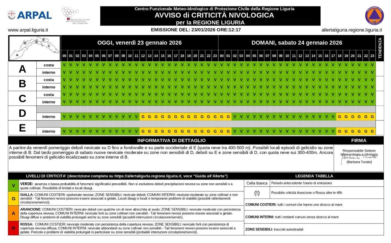 Arpal ha prolungato l’allerta meteo gialla per neve in Liguria sulla zona D (Versanti padani di ponente) e sulla zona E (Versanti padani di levante) dalle 12 alle 02:00 di domani sabato 24 gennaio. Dopo una breve pausa scatta una nuova allerta gialla per neve, sempre sui versanti padani /Zone D ed E), dalle 18:00 di domani alle23:59 di domani. Una vasta depressione atlantica sta convogliando sulla Liguria un flusso umido che ha determinato precipitazioni inizialmente sparse che stanno ora interessando il centro ponente; diffuse dal pomeriggio, di intensità debole, localmente moderata e cumulate fino a significative.