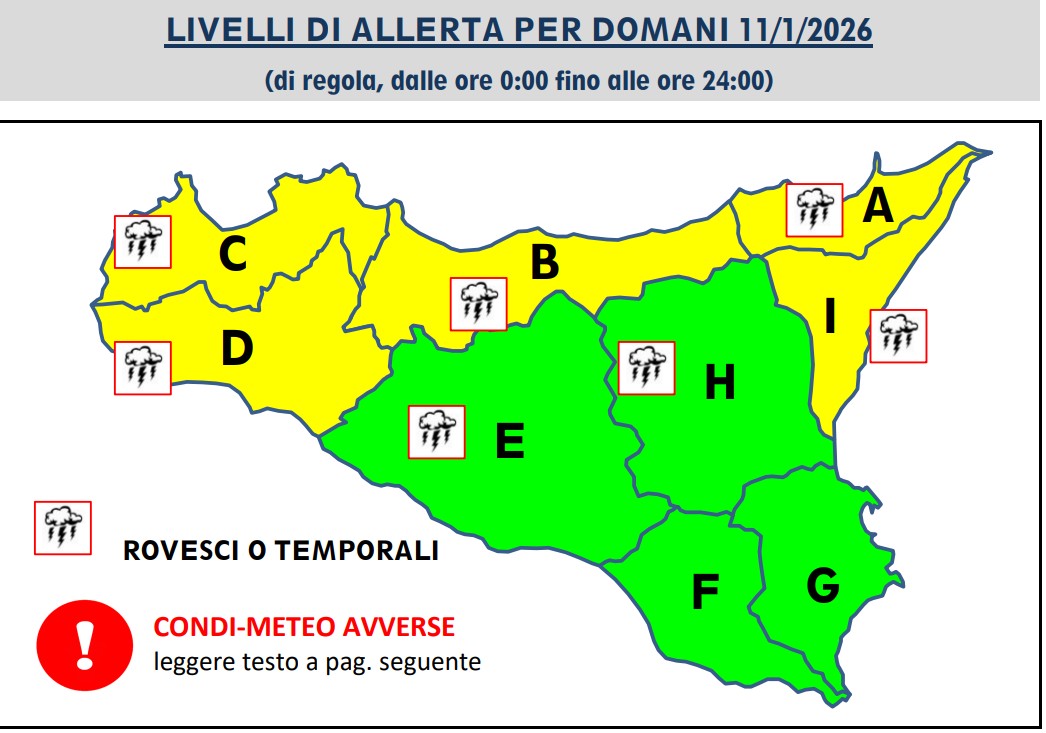 La Protezione Civile regionale della Sicilia ha diramato un’allerta meteo per rischio meteo-idrogeologico e idraulico valida per tutta la giornata di domani, domenica 11 gennaio. È stata emessa allerta gialla per tutta la fascia settentrionale, compresi i settori orientali e occidentali. “Si prevede il persistere di venti di burrasca da quadranti occidentali, con rinforzi di burrasca forte”, si legge nel bollettino di allerta. Previste anche “precipitazioni sparse, anche a carattere di rovescio o temporale, sulla Sicilia tirrenica e nordorientale, con quantitativi cumulati da deboli a puntualmente moderati, specie sulle aree costiere tirreniche di Sicilia centro-orientale; isolate, sui settori interni, con quantitativi cumulati deboli”. Attese “nevicate al di sopra di 800-1000 metri, con apporti al suolo da deboli a moderati”.