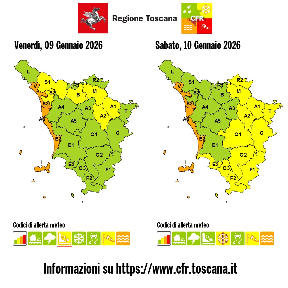 Allerta Meteo arancione prorogata dalla sala operativa della Toscana per mareggiate su costa centro-settentrionale e Arcipelago fino alle ore 9 di domani sabato 10 gennaio. È quanto riporta il Presidente della Regione Eugenio Giani, evidenziando anche l’allerta gialla per rischio idrogeologico in corso fino alla mezzanotte di oggi Toscana centro-settentrionale; allerta gialla per rischio vento in corso su costa centro-settentrionale e Arcipelago; allerta gialla per rischio neve nella giornata di domani su Toscana orientale. Nella notte e fino alle prime ore di domani, sabato, possibili nevicate generalmente oltre 600-800 metri con accumuli di circa 5-10 cm, ma possibili anche a quote inferiori (400-600 m) sulle zone appenniniche, aretino, Pratomagno, senese e amiatino.
