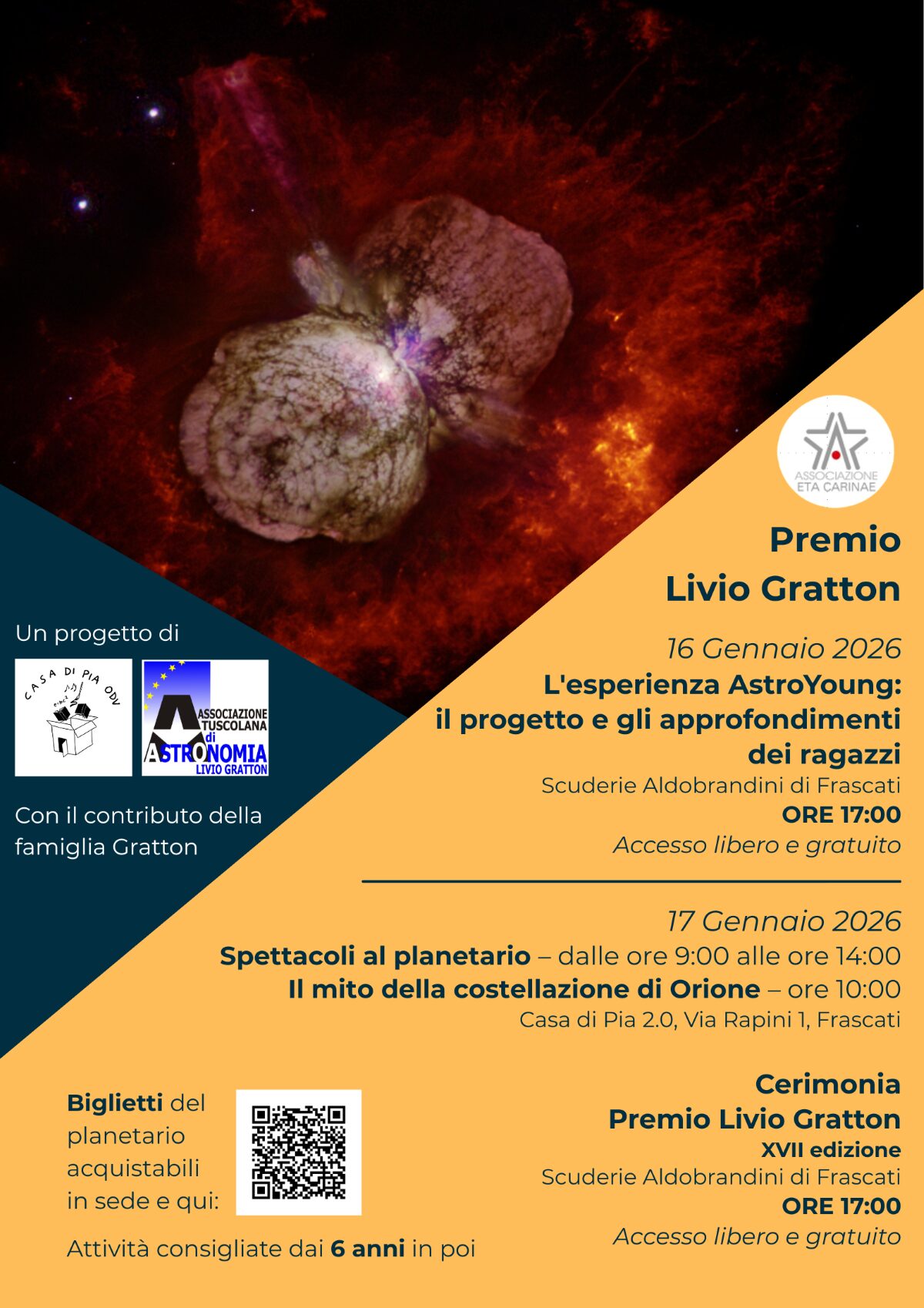 Nelle giornate del 16 e 17 gennaio la città di Frascati ospiterà una ricca rassegna di eventi per il pubblico di tutte le età, dedicati alla scoperta dell’Universo e al ricordo dell’Astrofisico Livio Gratton. A organizzare gli eventi, l’Associazione Eta Carinae, l’Associazione Tuscolana di Astronomia (ATA) e l’Associazione Casa di Pia. Venerdì 16 gennaio, alle ore 17:00, presso le Scuderie Aldobrandini di Frascati si terrà l’evento finale del progetto “AstroYoung” che vede protagonisti studenti e studentesse delle scuole medie del territorio. I giovani astrofili presenteranno al pubblico le attività svolte e gli argomenti di astronomia approfonditi durante il percorso formativo. Un momento speciale per ricordare l’impegno del Prof. Livio Gratton nella divulgazione scientifica e la sua grande attenzione verso il mondo della scuola. L’evento è ad accesso libero e gratuito.