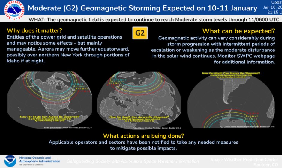 Come previsto dagli esperti dello Space Weather Prediction Center (SWPC) della NOAA, l’impatto con la Terra è avvenuto il 10 gennaio, dando origine a una tempesta geomagnetica classe G2, moderata ma spettacolare. Le vibrazioni del campo magnetico terrestre si sono propagate nella magnetosfera, e lievi tempeste classe G1 potrebbero continuare fino al 12 gennaio.