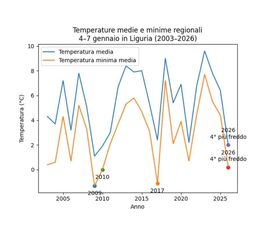 “Nei giorni 4-7 gennaio 2026, la Liguria ha registrato temperature medie regionali significativamente inferiori alla norma climatica, con un raffreddamento diffuso su tutto il territorio. La temperatura media regionale del periodo, pari a circa 2°C, colloca il 2026 al quarto posto tra gli inizi di gennaio più freddi degli ultimi vent’anni, dopo il 2009, il 2010 e il 2017. Anche le temperature minime medie risultano basse, pur senza raggiungere valori estremi su singole località”. Lo riporta Arpal. “I dati indicano che il freddo percepito non è legato a episodi puntuali particolarmente intensi, ma a una persistenza di condizioni fredde su scala regionale, che ha contribuito ad abbassare in modo netto le temperature medie”, viene precisato.