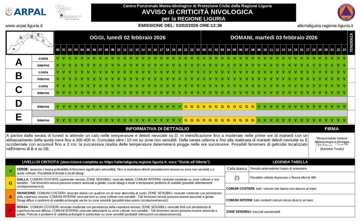 La mattinata odierna è iniziata con cielo grigio e deboli piogge sparse. Ancora precipitazioni sparse dal pomeriggio, che in serata potranno avere intensità anche moderata sul centro della regione e potranno assumere carattere nevoso su D ed E a causa dell’abbassamento dello zero termico e della quota neve sui versanti padani. Arpal segnala infatti dalla serata deboli nevicate nell’entroterra con quota neve in calo fino al suolo su D e su parte orientale di E. Le nevicate proseguiranno fino alle prime ore della mattina di domani con accumuli sui versanti padani del savonese moderati su zone non sensibili e deboli sui tracciati autostradali (fino a 8-10 cm sulla Savona-Torino), mentre su E si attendono circa 2-4 cm sulle zone sensibili. Si segnalano inoltre possibili episodi di gelicidio, più probabili nelle zone interne del centro della regione (es. Valle Scrivia, Valle Stura). Precipitazioni con cumulate areali significative su A e B, fino a elevate su C. Esaurimento dei fenomeni a partire da Ponente dalle ore centrali di martedì 3 febbraio, pur con deboli piogge sparse residue.
