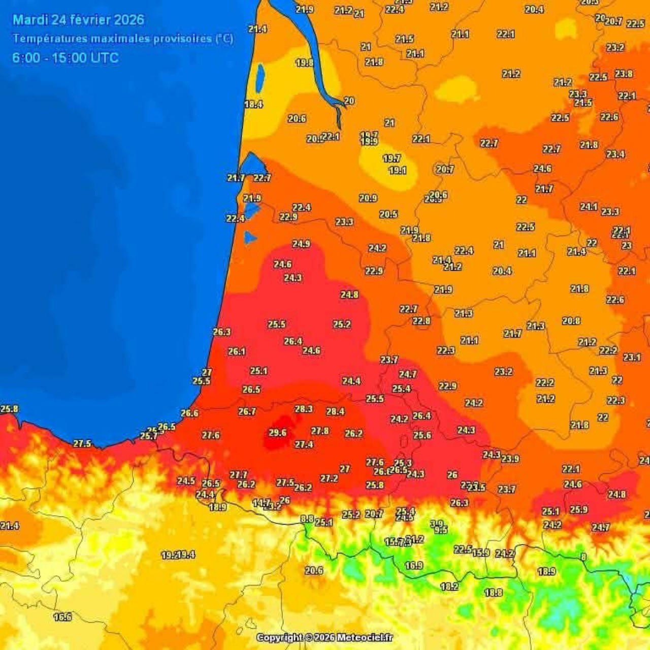 Tra Paesi Baschi, Cantabria e zone pedemontane dei Pirenei, oltre all’avvezione calda su larga scala, ha agito un evidente effetto favonico. L’aria, forzata a superare la catena montuosa, si è riscaldata per compressione nella discesa sul versante sottovento, contribuendo a massime superiori ai 28 °C in pieno inverno.