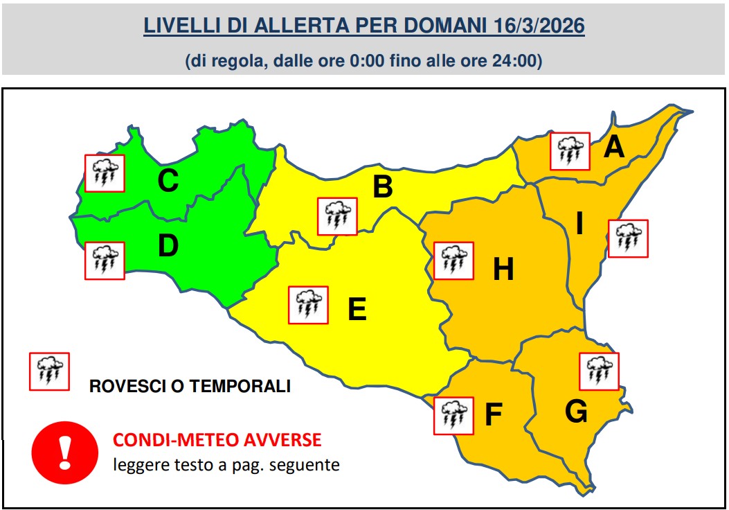 La Protezione Civile regionale della Sicilia ha diramato un’allerta meteo arancione per rischio meteo-idrogeologico e idraulico sul settore orientale dell’isola e gialla sul settore centrale. L’allerta è valida per la giornata di domani, lunedì 16 marzo. “Si prevede il persistere di precipitazioni da sparse a diffuse, anche a carattere di rovescio o temporale, specie sui settori orientali. I fenomeni saranno accompagnati da rovesci di forte intensità, forti raffiche di vento, locali grandinate ed attività elettrica”, si legge nel bollettino di allerta. In particolare, sono previste “precipitazioni diffuse e persistenti, anche a carattere di rovescio o temporale, su zone orientali, con quantitativi cumulati da moderati a puntualmente elevati; sparse, anche a carattere di rovescio o temporale, su zone centrali, con quantitativi cumulati puntualmente moderati; da isolate a sparse, localmente anche a carattere di rovescio o temporale, su restanti zone, con quantitativi cumulati deboli”.