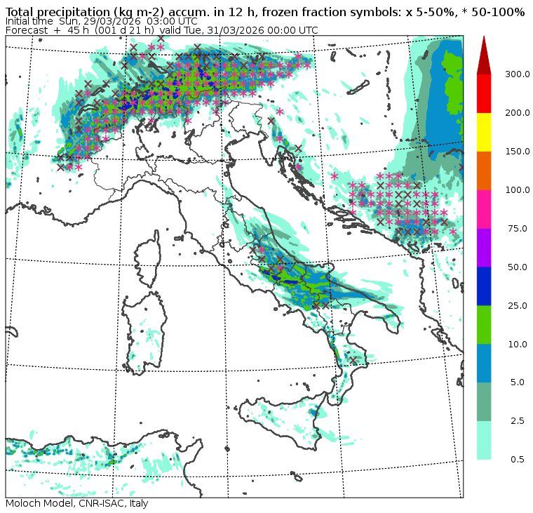 La nuova irruzione fredda inizierà domani, lunedì 30 marzo, sull’Adriatico con forti piogge e temporali che colpiranno Abruzzo, Molise, Puglia, zone interne di basso Lazio e Campania, proprio nella serata di lunedì, mentre il fronte freddo avrà raggiunto le Alpi scatenando bufere di neve molto importanti su Svizzera e Austria.