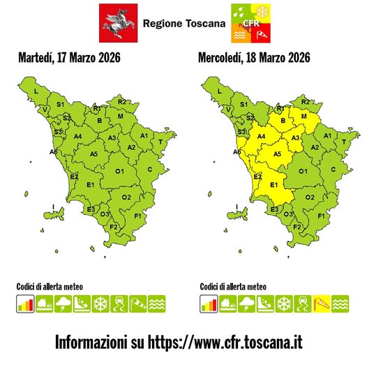 Un’allerta meteo gialla per rischio vento, valida dalle 9 di domani, mercoledì 18 marzo, fino alla mezzanotte, è stata emessa dalla Sala operativa della Protezione Civile regionale della Toscana. Sul territorio toscano è infatti in arrivo in queste ore un fronte freddo che porterà in particolare sul centro della regione, dalla costa fino alle zone interne, nella giornata di domani, vento forte e deboli piogge sull’Appennino. Saranno possibili anche deboli nevicate oltre gli 800 metri. In particolare, si spiega dalla Sala operativa, già nella giornata di oggi è previsto un rinforzo dei venti di grecale con raffiche fino a 40-50km/h in pianura e fino a 50-60km/h sui rilievi centro-meridionali e sulla costa.