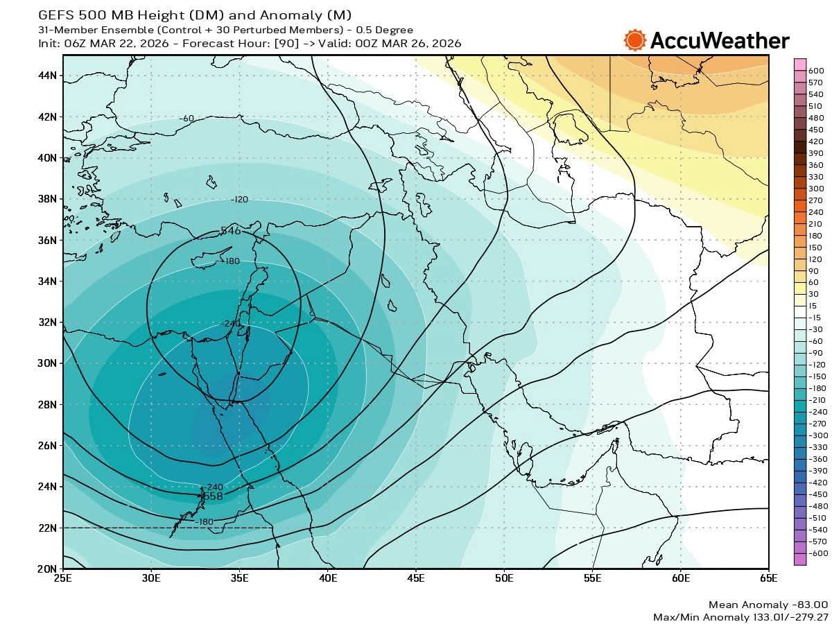 Nella seconda parte della settimana, una depressione in quota quasi stazionaria manterrà condizioni instabili su gran parte della regione. Le piogge diventeranno più diffuse, con accumuli localmente abbondanti tra l’Iran occidentale, l’Iraq settentrionale e le zone montuose di Siria, Libano e Arabia Saudita occidentale. Le tempeste di sabbia e polvere continueranno a interessare le aree desertiche sottovento ai temporali più intensi e quelle spazzate dai venti più forti.