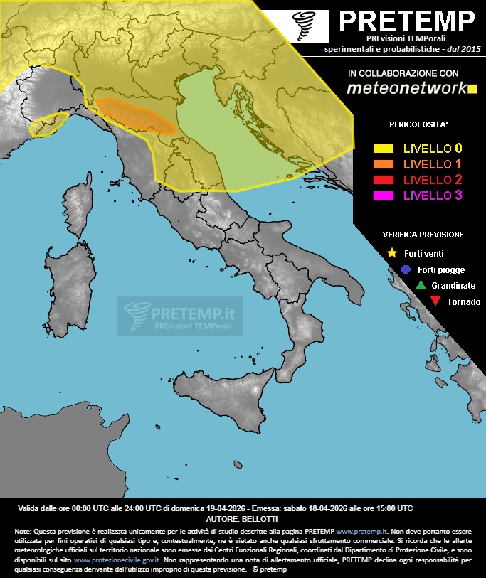 Per quanto riguarda le are Livello 0, “tra il Piemonte e la Lombardia della convezione sottovento potrà già attivarsi durante la mattina per l’effetto del fronte freddo in avvicinamento. Successivamente, nelle ore pomeridiano-serali, il calo di geopotenziali in quota produrrà dei temporali dal Piemonte orientale verso levante. Spostandosi verso levante, sul Triveneto, è possibile che nel pomeriggio dei temporali si sviluppino nelle aree alpine, eventualmente organizzati come un QLCS e scendano fino alle pianure. La fenomenologia su queste zone dovrebbe essere comunque meno intensa, per il CAPE più contenuto. Saranno possibili grandinate di piccolo diametro anche con accumulo, isolate raffiche di vento e forti piogge passeggere“.