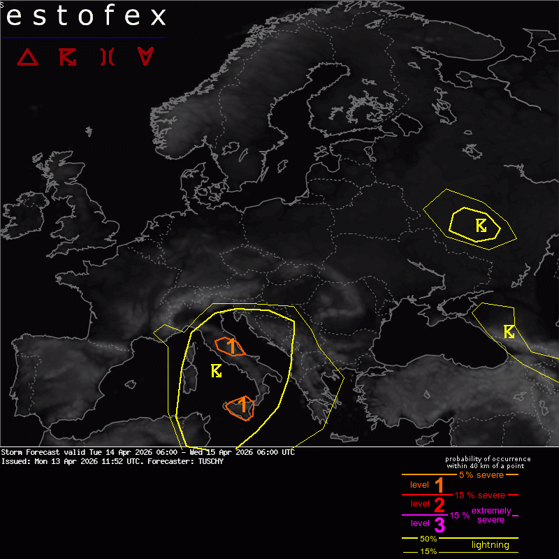 L’area meridionale del Paese, in particolare la Sicilia, è tra le zone maggiormente attenzionate da ESTOFEX, che ha emesso un’allerta di livello 1. L’avvicinamento della “goccia fredda” (cut-off) da Ovest/Sud-Ovest determinerà condizioni ideali per la formazione di temporali intensi. Nella fase iniziale dello sviluppo convettivo, le celle temporalesche potrebbero generare grandine di grosse dimensioni e violente raffiche di vento. Con il passare delle ore, i temporali tenderanno a unirsi in sistemi più organizzati (cluster), portando rovesci molto abbondanti. ESOFEX segnala che durante la notte tra il 14 e il 15 aprile il rischio di precipitazioni estreme potrebbe aumentare sensibilmente sulla Sicilia nordoccidentale: le correnti in quota tenderanno a indebolirsi in prossimità del centro del vortice, causando un blocco dei temporali che potrebbero scaricare ingenti quantità di pioggia sulle stesse zone per diverse ore.
