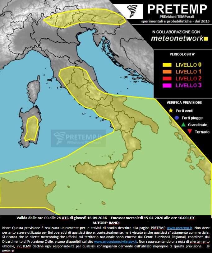 “Il cut-off in quota che da qualche giorno interessa buona parte della Penisola, tenderà ad evolvere lentamente verso Sud continuando a mantenere instabilità in prevalenza sul centro-sud Italia, con attività temporalesca sparsa che nelle ore notturne sarà più frequente sui mari meridionali e in quelle diurne sulle zone interne e del settore appenninico centro-meridionale. Qualche locale temporale di breve durata non si esclude, nelle ore pomeridiane, sull’arco alpino centro-orientale“, si legge nel bollettino PRETEMP. “Viene assegnato un ampio Livello 0 dalle zone interne del centro a quelle meridionali includendo la Sardegna interna per forti piogge concentrate, che potranno essere più consistenti sul Sud della Calabria e sulla Sicilia, grandinate in genere di piccole dimensioni ma talora con deposito al suolo, intense raffiche di vento e trombe marine. Un secondo livello 0 viene emesso per l’arco alpino centro-orientale in merito a brevi rovesci e isolate grandinate di piccole dimensioni limitatamente alle ore pomeridiane“.