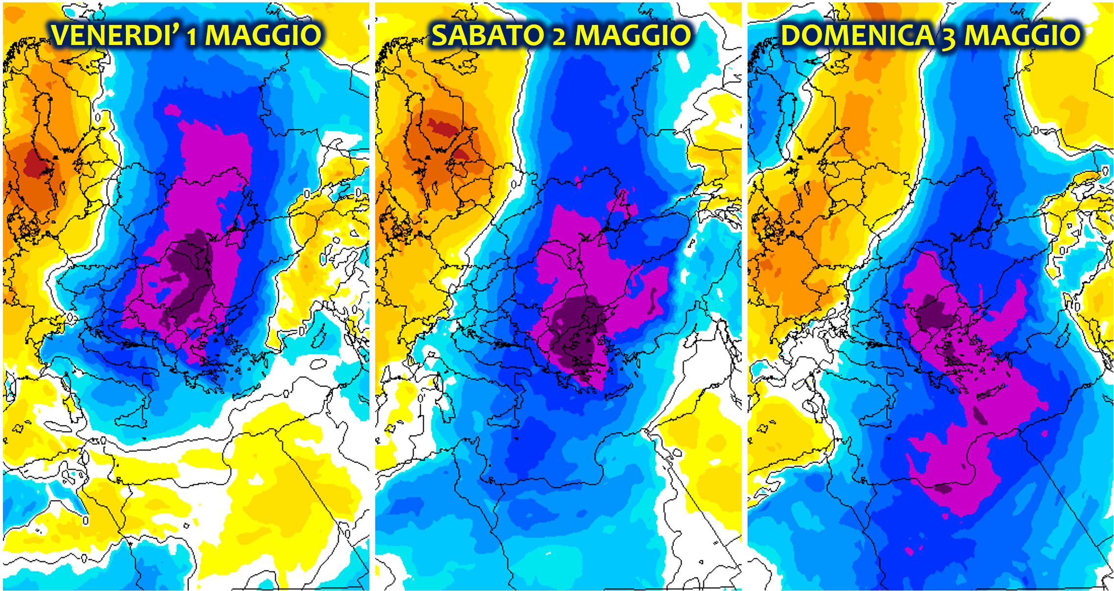 La situazione meteorologica è destinata a subire un capovolgimento totale a partire da lunedì 4 maggio. Il flusso atlantico riprenderà vigore, smantellando il blocco freddo russo e spingendo una serie di perturbazioni verso l’Europa occidentale. Questo cambio di circolazione richiamerà caldo scirocco al Sud, con un repentino aumento termico e l’arrivo di una fitta coltre di sabbia del Sahara che renderà i cieli giallastri, tipici del clima nordafricano. Contemporaneamente, il Nord e le regioni tirreniche, che erano rimaste all’asciutto durante l’irruzione fredda, diventeranno il bersaglio di piogge torrenziali e nubifragi persistenti. Sull’arco alpino la neve tornerà a cadere abbondante, ma solo a quote medie, generalmente sopra i 1.000/1.400 metri di altitudine.