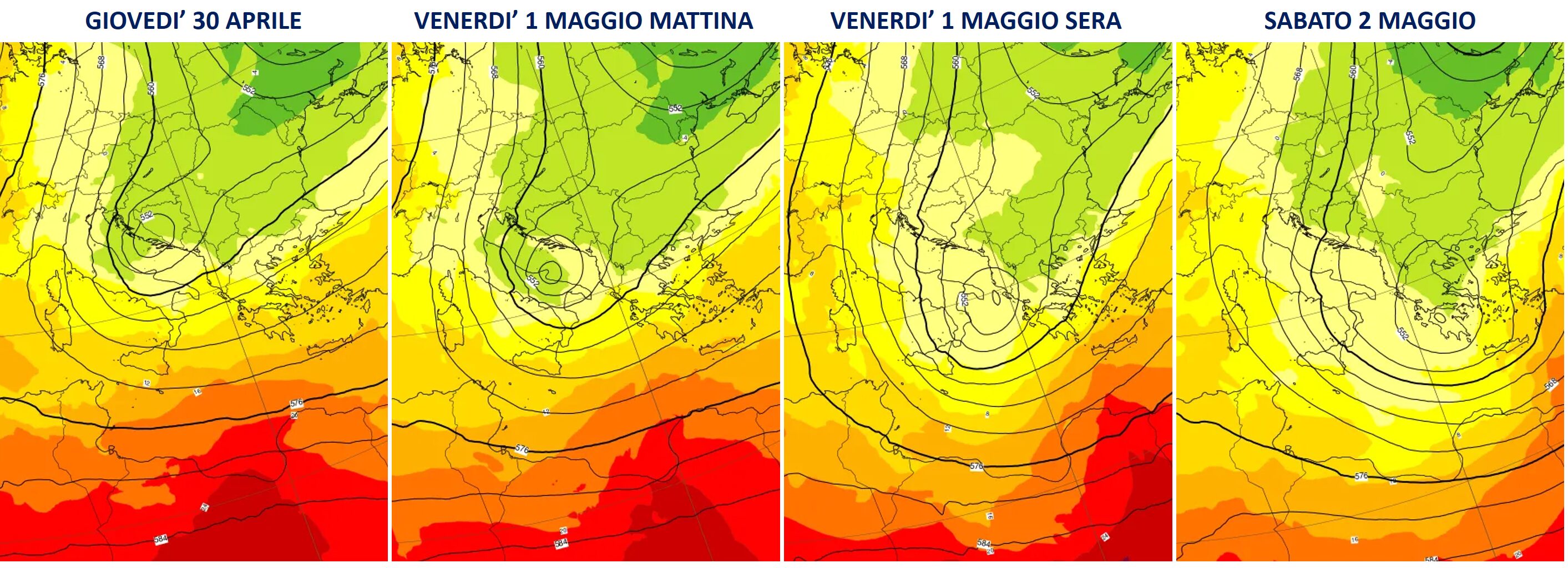 Gli ultimi aggiornamenti forniti dal modello europeo ECMWF hanno mostrato un parziale cambio di rotta nella traiettoria della perturbazione, spostando l’asse del maltempo dall’alto Adriatico verso il medio e basso Adriatico. Questo significa che il giorno dell’1 maggio, venerdì prossimo, sarà pesantemente condizionato da freddo e maltempo su gran parte del versante adriatico e delle regioni meridionali. Le regioni più colpite saranno l’Abruzzo, il Molise, la Puglia, la Basilicata, la Calabria e la Sicilia, dove le festività della Festa dei Lavoratori saranno rovinate da piogge battenti, forti raffiche di vento e nevicate che potrebbero scendere a quote insolitamente basse per il mese di maggio.
