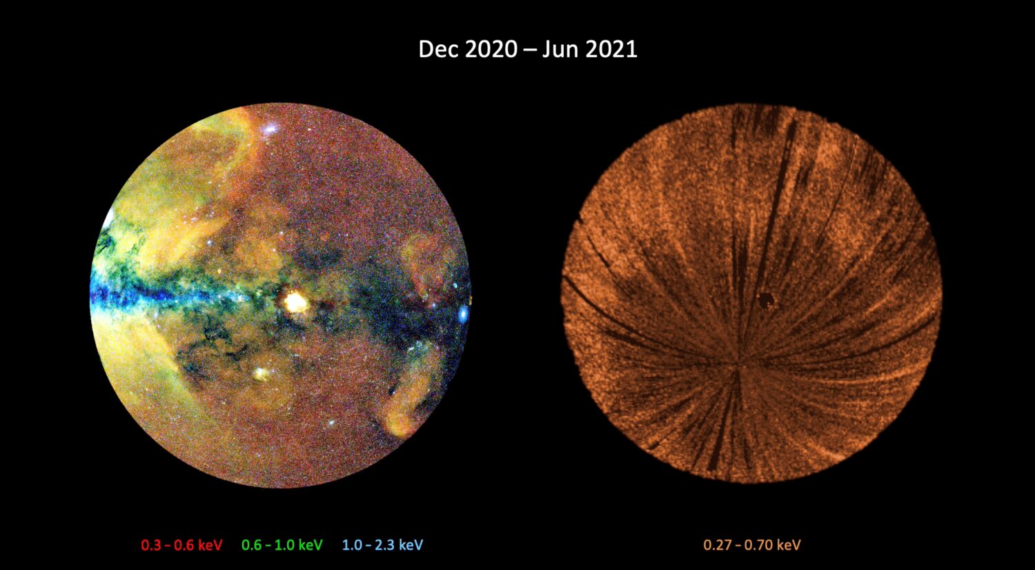Il bagliore a raggi X si genera quando gli ioni pesanti contenuti nel vento solare – come carbonio e ossigeno – catturano elettroni da atomi neutri presenti nella parte più esterna dell’atmosfera terrestre (detta geocorona) e in tutto il Sistema solare (eliosfera). Finora, questa emissione – nota come “scambio di carica del vento solare” – era considerata un semplice rumore di fondo che interferiva con le misurazioni di temperatura e densità degli ammassi di galassie e del plasma galattico, dati fondamentali per lo sviluppo dei modelli cosmologici. Sfruttando la posizione privilegiata di eROSITA, che si trova a 1,5 milioni di km dalla Terra, nel cosiddetto punto lagrangiano L2, è stato possibile mappare il cielo con grande precisione quattro volte tra il 2019 e il 2021. Questo ha permesso di ottenere la mappa più nitida mai realizzata del cielo nei raggi X “morbidi”.